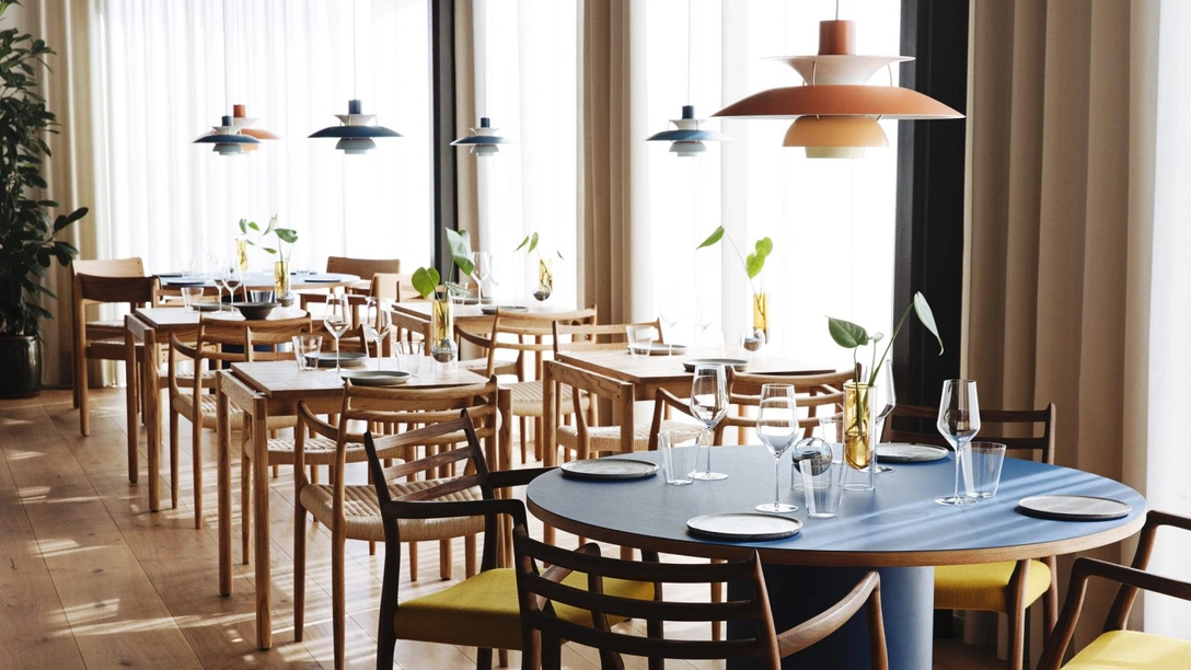 Студия Krøyer & Gatten разработала и изготовила большую часть мебели для проекта, в том числе круглые столы, покрытые синим линолеумом, простые скамейки и стулья с изогнутой спинкой. Их дополняют подвесные светильники, разработанные Полом Хеннингсеном (Poul Henningsen) в 1950-х годах, и набор стульев от JL Møllers Møbelfabrik.