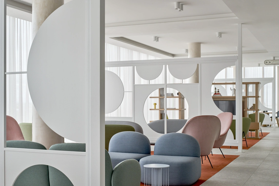 В лобби и лаундж-зонах ковры терракотового оттенка и мебель пастельных тонов создают уютную атмосферу, располагающую к неторопливой беседе и отдыху. Оттуда посетители прямиком попадают к угловому бару, из которого открывается панорамный вид на город. Барная стойка выполнена из древесины ореха, камня и металла и украшена живой зеленью. Рядом находится обеденная зона, центральным элементов которой стала скамья, облицованная плиткой кобальтового цвета.