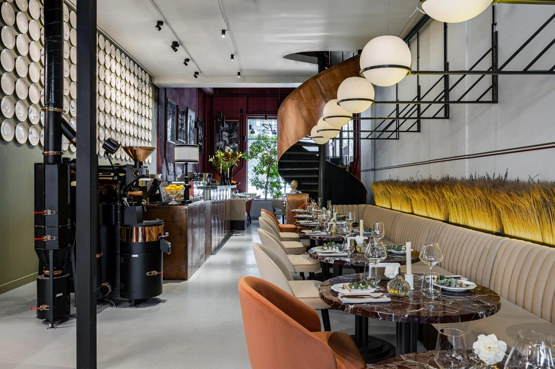 Помещение ресторана разделено на две части: светлую с круглыми столиками на двоих и терракотовую для больших компаний. Между ними, в самом центре, растет живое дерево. Бархатные диванчики с рельефной спинкой дополняют подсвеченные композиции из пучков колосьев, расположенные вдоль стен и создающие уютную, деревенскую атмосферу.