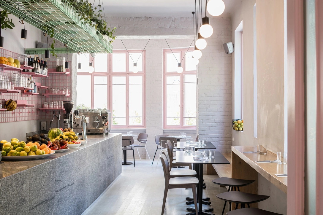 Неброская гамма (белый, бледно-розовый, серый, нежно-зеленый) служит отличным фоном для веганских продуктов, которые составляют основу меню этого заведения. Сгруппированные по цветам и красиво разложенные на стойке, подоконниках и металлических полках, яркие, экзотические овощи и фрукты служат главным декором. У кафе два выхода и две открытых веранды — одна со стороны улицы, другая во внутреннем дворике.