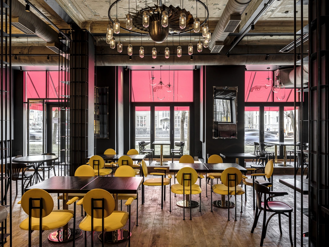 По стилистике получилась смесь европейского кафе с элементами индустриального стиля. Самый необычный предмет в интерьере — уникальная люстра в центре зала, сделанная из настоящей титановой лопасти двигателя Airbus, вокруг которого расположились строительные фонари в авторской интерпретации студии El Born.