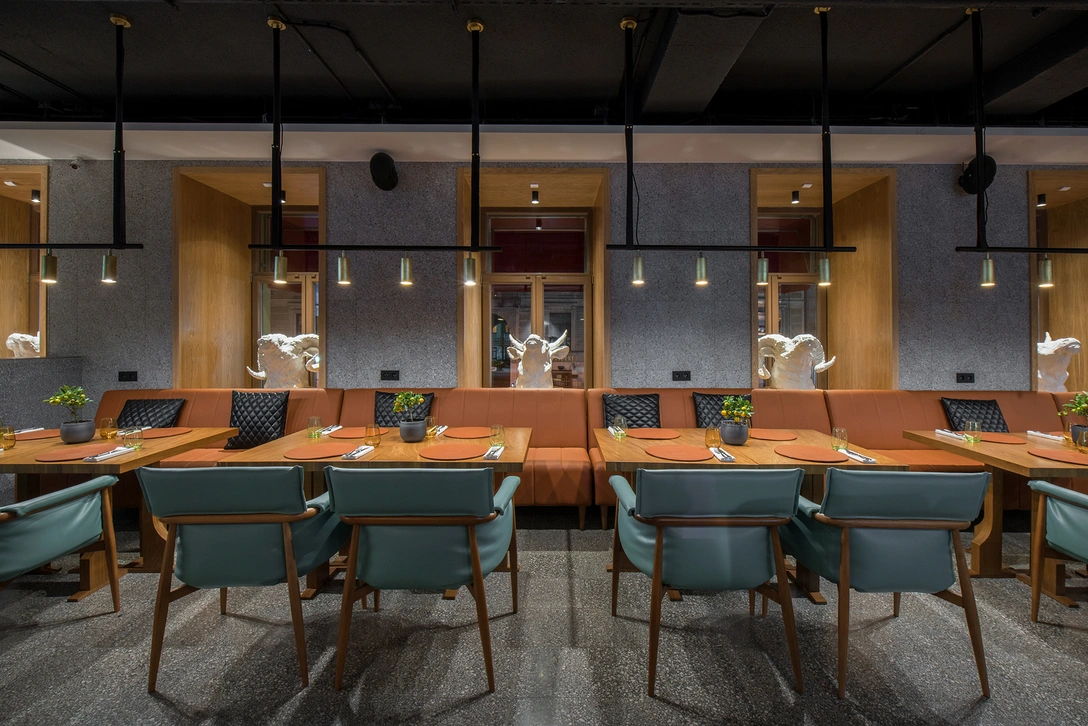 Оригинальный элемент декора — кожаная каретная стяжка на абажурах и простроченные барные стулья, кресла и подушки. Вся мебель, равно как и люстры, здесь выполнены на заказ по чертежам Archpoint. Гипсовые скульптуры в виде животных на окнах — визитная карточка Meat Head — переехали сюда из старого ресторана.