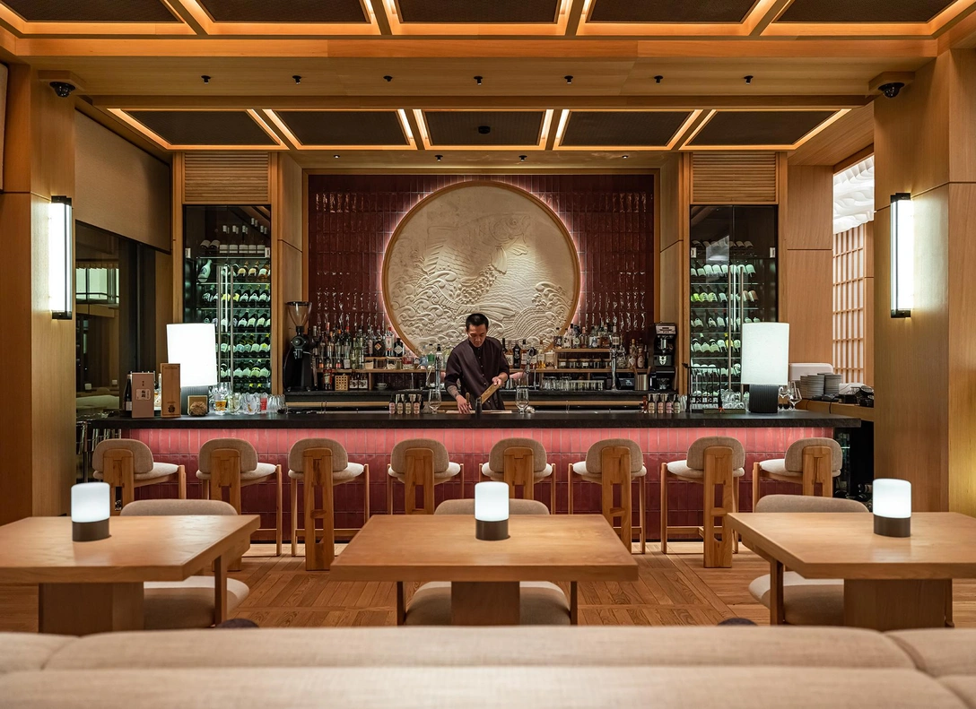 В отделке использованы природные материалы, главным образом, шпон дуба радиального распила и натуральный колотый камень. Полы облицованы каменными плитами с широкими швами и дубовым паркетом японского производства. Главное украшение ресторана — монументальный барный остров. Зона над ним отделана глянцевой плиткой цвета сангрии, которая гармонично дополняет натуральные дубовые панели.