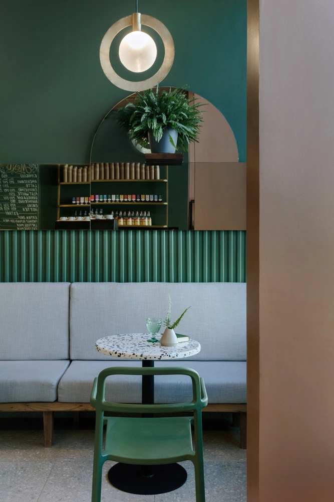 Небольшое пространство кофейни поделили на две части: барную зону, где готовится кофе, и объединенные посадочные места. За основу решили взять насыщенный лиственно-зеленый цвет — он поднимает настроение в любое время года. «Из окон кофейни видно лесной массив Воробьевых гор вдоль Москвы-реки, и нам хотелось, чтобы внутри все тоже утопало в зелени», — поясняет Влада Петерсон.