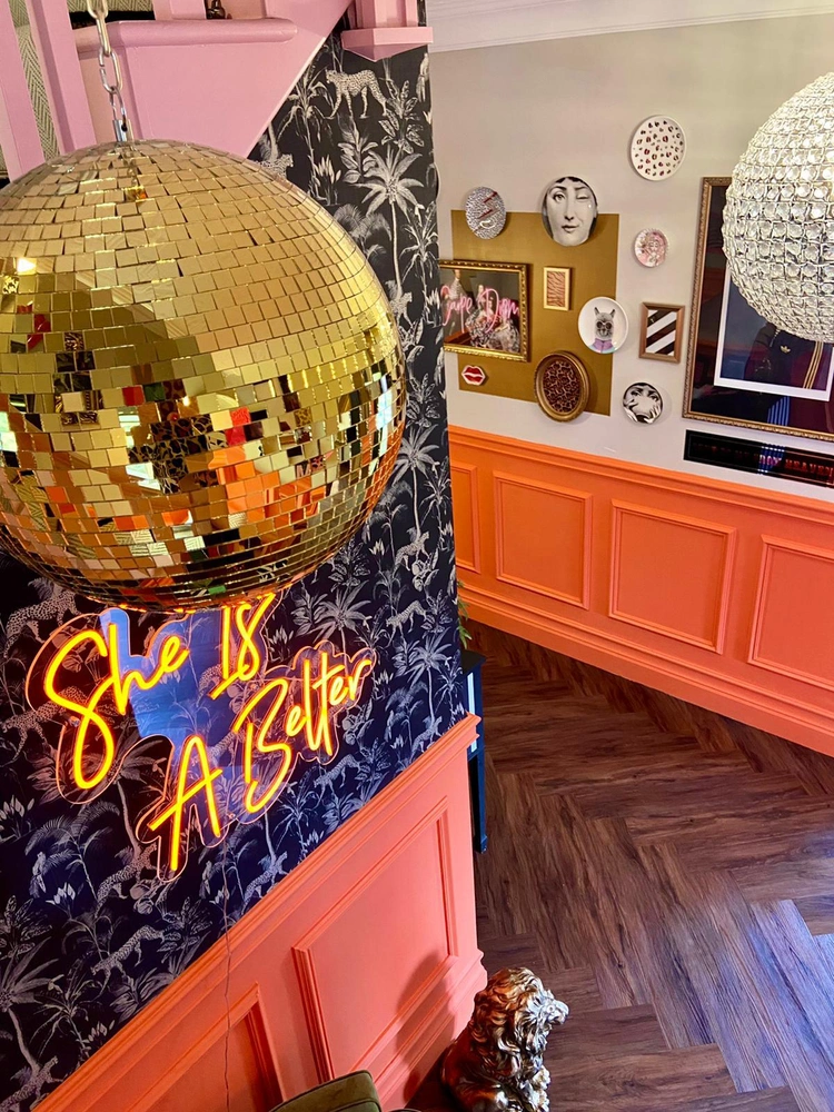 Лестницу тоже стало не узнать — небо и земля! А ведь достаточно было заменить устаревший ковролин, перекрасить ступени и перила в нежно-креветочный оттенок и установить снизу деревянные панели ярко-оранжевого цвета. Финальный штрих — разномастные рамки с фотографиями, детскими рисунками и постерами, неоновая вывеска с мотивирующей надписью She Is A Belter («Красотка») и диско-шары, отсылающие к дискотекам 1980-х (эпохе, которая является для Кимберли неизменным источником вдохновения).