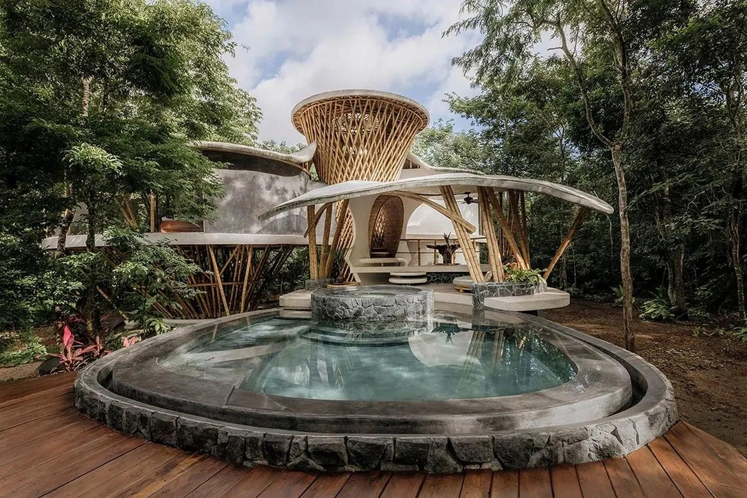 Эту необычную виллу в деревне Эль-Куйо (штат Юкатан) спроектировала для мексиканского проекта Awakening Sanctuary студия NOD. Она окружена густым зеленым ландшафтом, под который подстроена сама конструкция — построенная из бамбука она органично вписывается в джунгли, отражает идею единения с природой и принципы устойчивой архитектуры.