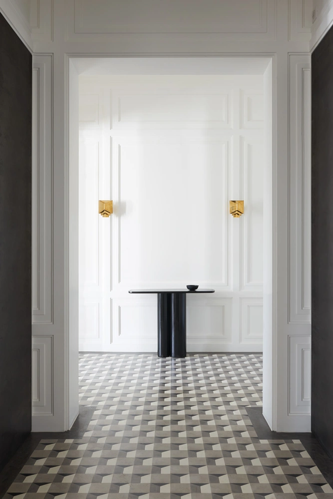Старые полы полностью демонтировали и заменили на паркет из состаренного дуба. В прихожей постелили «ковер» с геометрическим узором-обманкой, который кажется объемным и выполнен из искусственного мрамора ручной работы. Стены в интерьерах выкрасили в белый цвет и оставили фактически «голыми». Это решение, по замыслу автора, призвано подчеркнуть первозданную красоту декоративных рельефов. Интерьер гостиной тоже был решен в белом цвете. В гостиной по бокам от камина архитектор расположил встроенные шкафы и сделал их темными, почти черными. При этом они не вырываются из общего контекста, а, напротив, придают комнате глубину. Во всех своих проектах Диран уделяет особое внимание свету. Он признается: «Мне нравится, когда свет начинает играть главную роль в помещении». Именно поэтому в доме так много зеркал, которые его отражают и тем самым увеличивают освещенность.