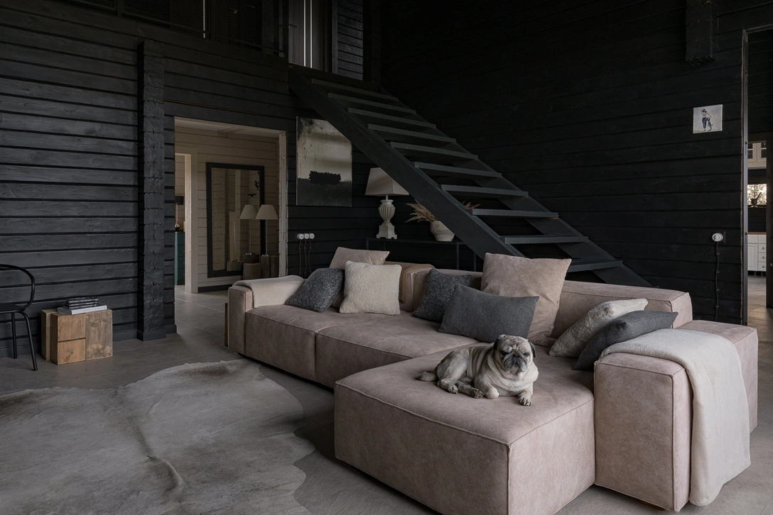 Проектируя дом для себя, я хотела испробовать все то, на что мало кто соглашается. Например, сделать здание полностью черным — и внутри, и снаружи. Многие боятся темных оттенков, но на самом деле они могут быть очень уютными. Все наши гости говорят, что у нас тепло, как дома у бабушки. Даже мой супруг изменил мнение на счет темной палитры, но об этом позже.