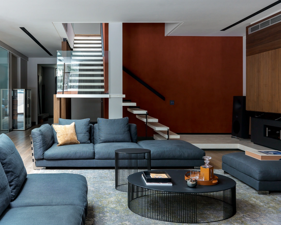 Работы по реконструкции здания и оформления интерьеров выполнили архитектор Алексей Семеняк, основатель студии Architec.one, и дизайнер Ия Щербакова. «В основу концепции легла идея объединения экстерьера и интерьера, — рассказывают авторы проекта. — Так, например, было выкопано 68 кубометров грунта, чтобы из окон первого этажа стала видна не бетонная подпорная стенка, а место для камина, барбекю и личного газона с шезлонгами».
