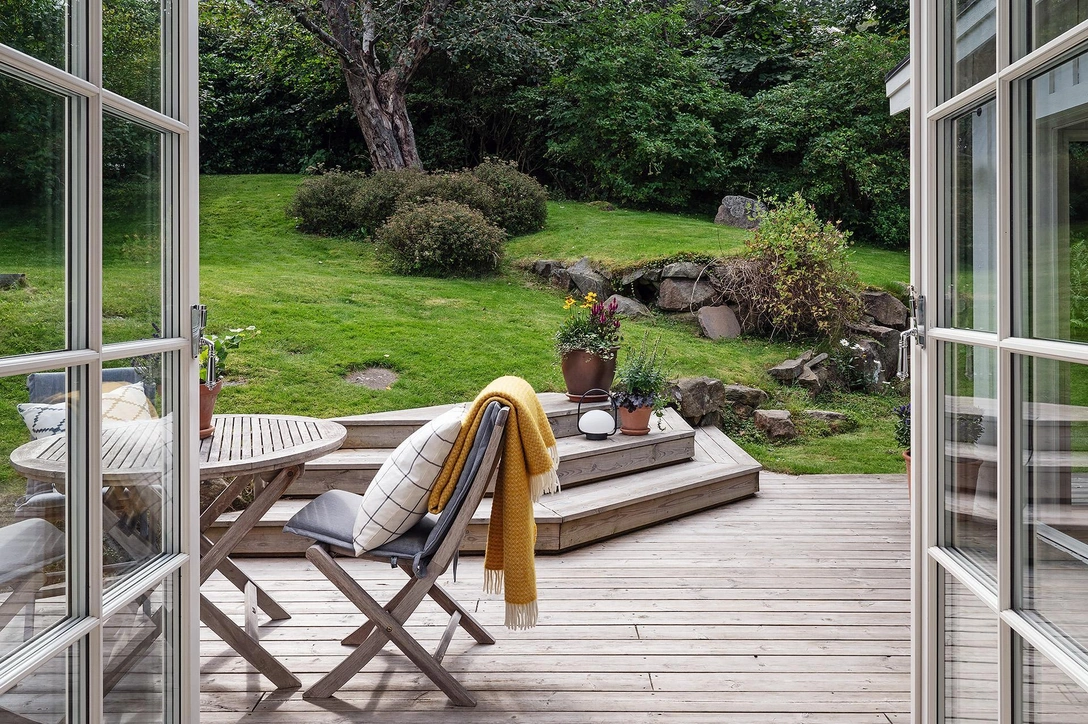 Из столовой можно выйти в сад — здесь хорошо сидеть летними вечерами. На небольшой возвышенности есть даже небольшая зона с шезлонгами. А как начнет немного холодать — можно переместиться на уютную летнюю веранду и собраться за деревянным столом.