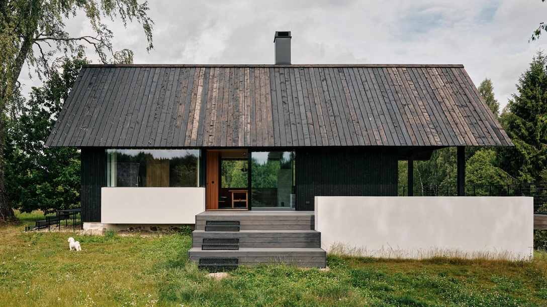 Дом нарочито прост по виду, его стены и крыша облицованы темной мореной древесиной. «Чтобы вписать здание с окружающий пейзаж, мы использовали как можно больше дерева, сделав это разными способами. Здесь деревянная крыша, фасад и интерьеры, — отмечает Ханна Кариц, — Хотелось добавить что-то новое, но при этом отразить историю домов вокруг и задействовать старый фундамент».