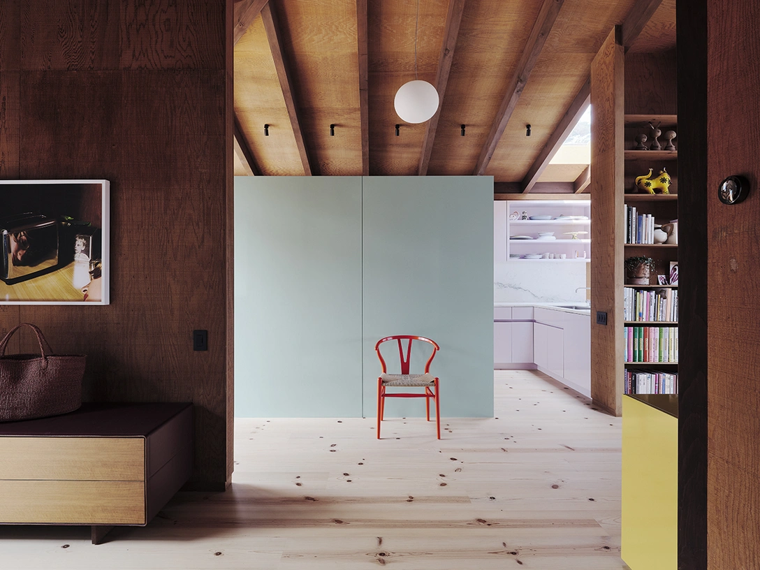 Кухню, расположенную прямо напротив входа в дом, Бретт скрыл за светло-бирюзовым шкафом-перегородкой. Со стороны коридора он кажется частью стены, а с кухонной стороны в нем организованы секции для хранения и встроена часть техники. Справа от кухни находится библиотека с высокими стеллажами и зона столовой.