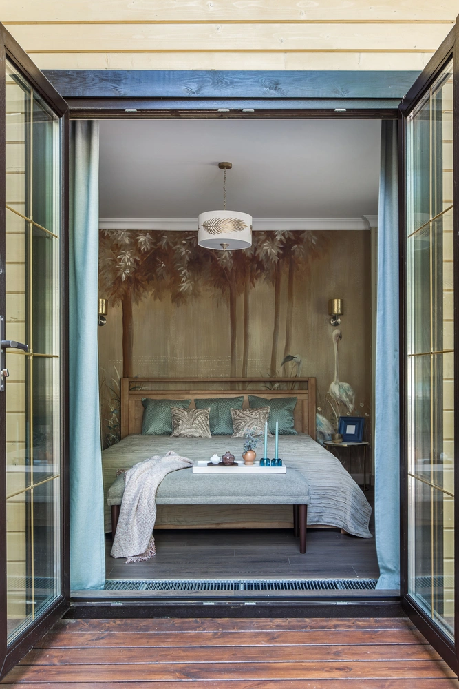 «На одной из первых встреч заказчики попросили меня подобрать для спальни панно. Я решила остановиться на лесной тематике и выбрала рисунок грациозными цаплями на фоне деревьев. Именно он в итоге сформировал цветовую гамму всей комнаты», — рассказывает Евгения.