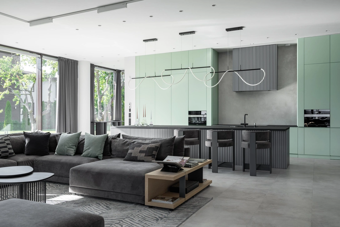Самый заметный предмет в интерьере — восьмиметровый кухонный гарнитур с четырехметровым островом. Об оттенке, в который она выкрашена, споры идут до сих пор. Для кого-то это цвет мятной пасты, кто-то видит оливковый, кто-то — светло-бирюзовый. Со стороны кажется, что все фасады — это все кухня, но на самом деле за двумя фасадами скрывается проход в хозблок и котельную, еще два позволяют скрыть рабочую поверхность с вытяжкой и варочной поверхностью, создав ощущение монолитности и «чистоты».