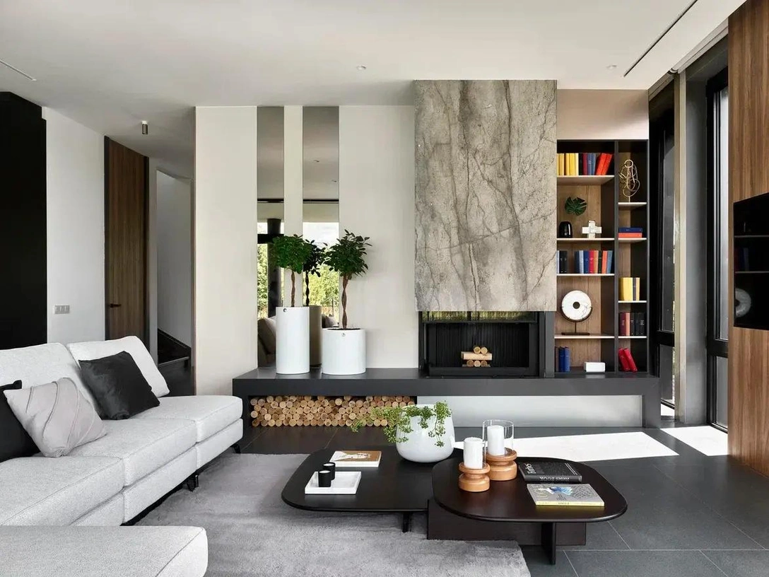 Гостиная, фрагмент. Журнальные столики, Ditre Italia. Крупноформатный керамогранит, ArchSkin.