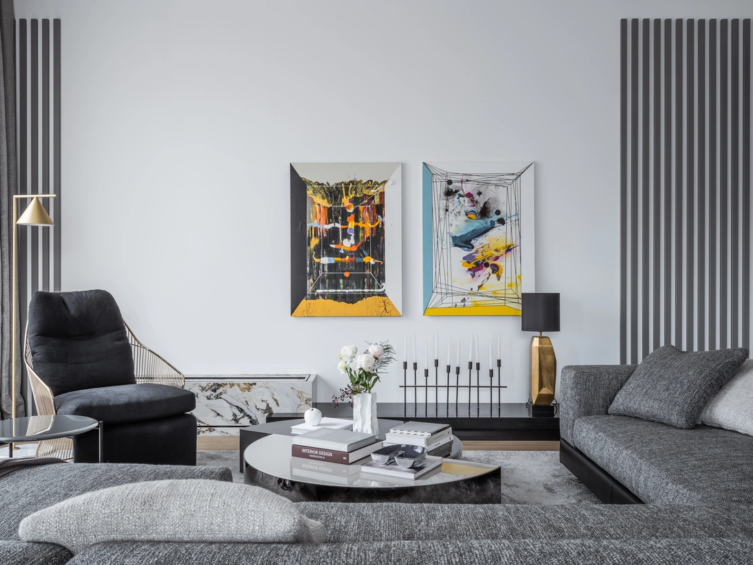 В зоне столовой внимание привлекают мягкие кресла, напоминающие облака от Ligne Roset. Светильник над круглым обеденным столом перекликается со светильниками над кухонным островом-барной стойкой и световой композицией в гостиной, визуально объединяя разные зоны в единое целое.