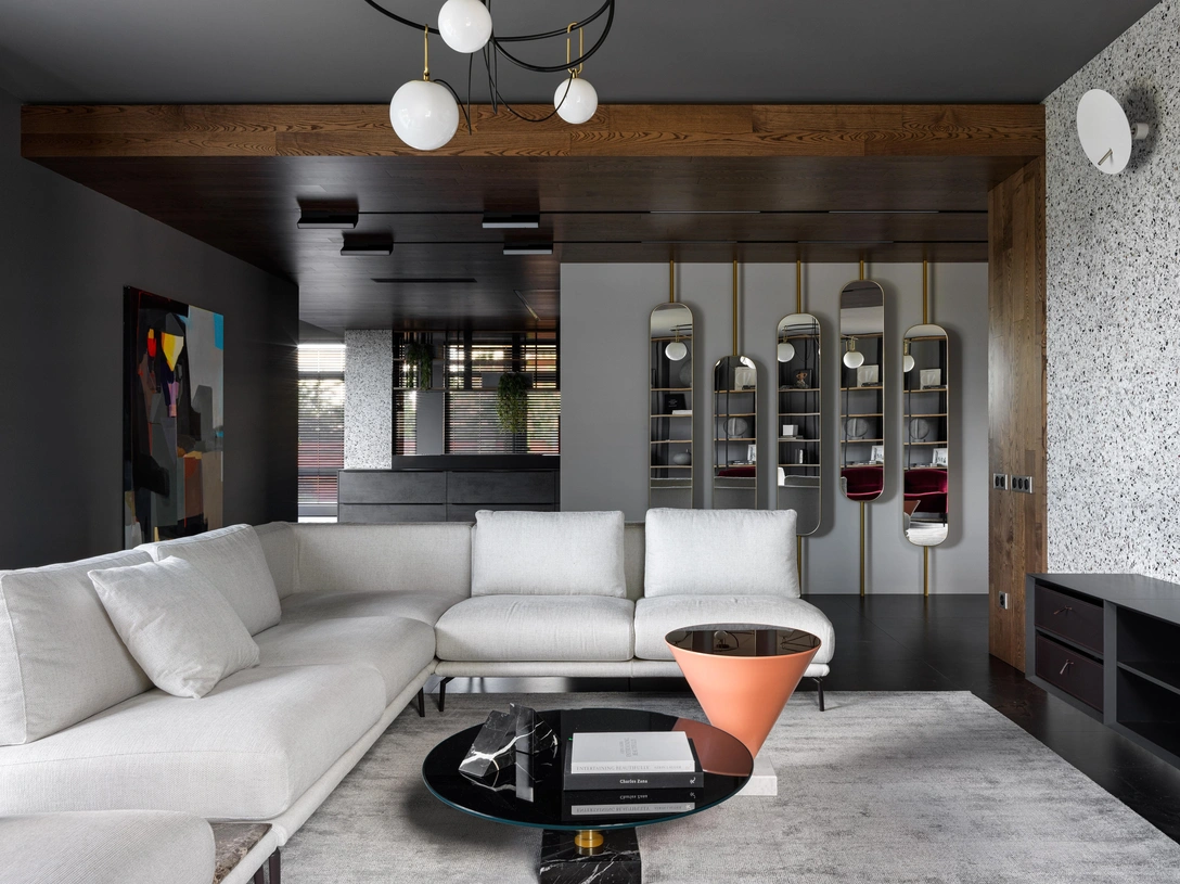 «После первой встречи с заказчиками появилось четкое понимание, что интерьер не должен быть скучным и „вылизанным“», — рассказывает дизайнер Алена Абрамова. Стиль определился с появлением группы светильников, предназначенных для холла. Именно они задали общее настроение и появление здесь мотивов неомемфиса. Алене было важно, чтобы он не считывался прямо и буквально, но давал о себе знать повсюду.