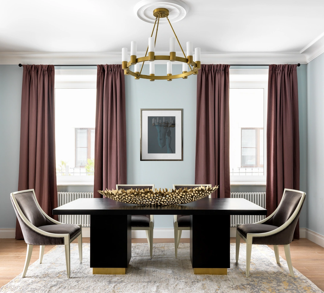 Главная роль в гостиной отведена дивану в обивке «зебра» на прозрачных акриловых ножках от Theodore Alexander. Он появился здесь далеко не сразу. «История поиска дивана в гостиную была долгой и мучительной, — рассказывает дизайнер. — У всех участников процесса было свое видение того, каким он должен быть. К „зебре“ хозяева поначалу отнеслись настороженно, но в итоге он оказался лучшей находкой! Традиционная форма, модная отделка, очень удобный — он внес ту самую экзотическую нотку, которой так не хватало интерьеру и сделал это весьма „интеллигентно“».