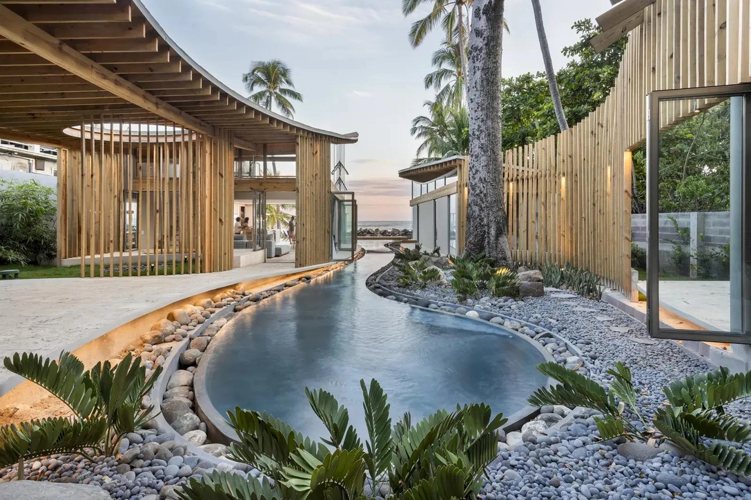 Дом разделен на две половины, чтобы сохранить растущие на участке деревья и спланировать бассейн, который проходит через центр виллы к океану, как мини-река. Планировка здания и участа задействует окружающую природу, делая интерьеры частью экстерьера и наоборот.