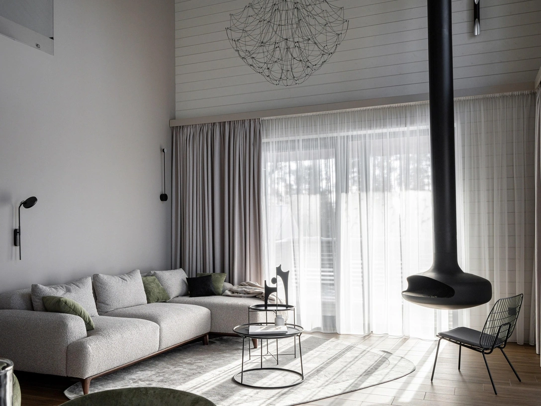 Дом расположен в густом сосновом лесу на берегу Финского залива. Заказчики попросили преимущественно использовать в отделке белый цвет. Его мы дополнили природными тонами, которые присущи местности: серый, песочный, зеленый, натуральные оттенки дерева.