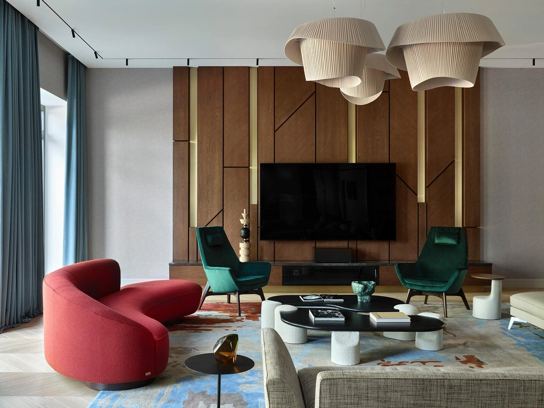 На ТВ-консоли — шкатулка и тотем, Zlata Kornilova, Modenature. На полу — доска, Finex. Ковер сделан на заказ в Индии по эскизам дизайнера. На большом журнальном столе — ваза, Levadnaja ceramics. На журнальном столике рядом с диваном — скульптура, Ferm Living, GK Concept.