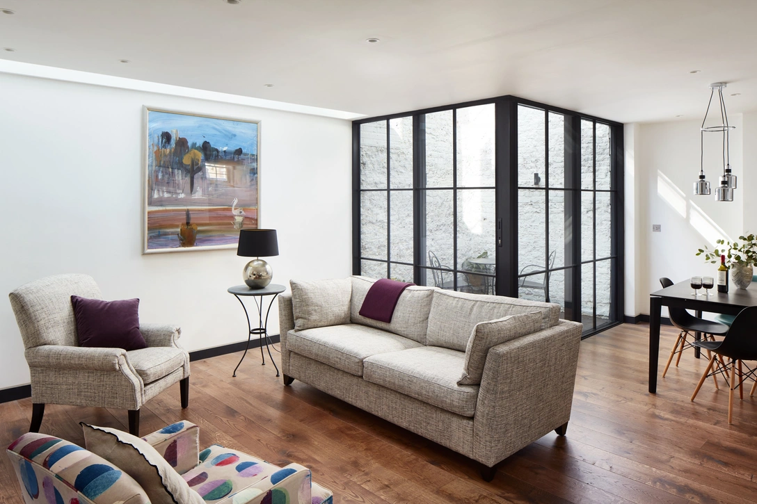 Решив ключевые технические нюансы, дизайнеры сосредоточились на решении проблемы освещения. Чтобы наполнить светом пространство первого этажа, дизайнеры провели перепланировку и создали новый внутренний двор с панорамным остеклением.