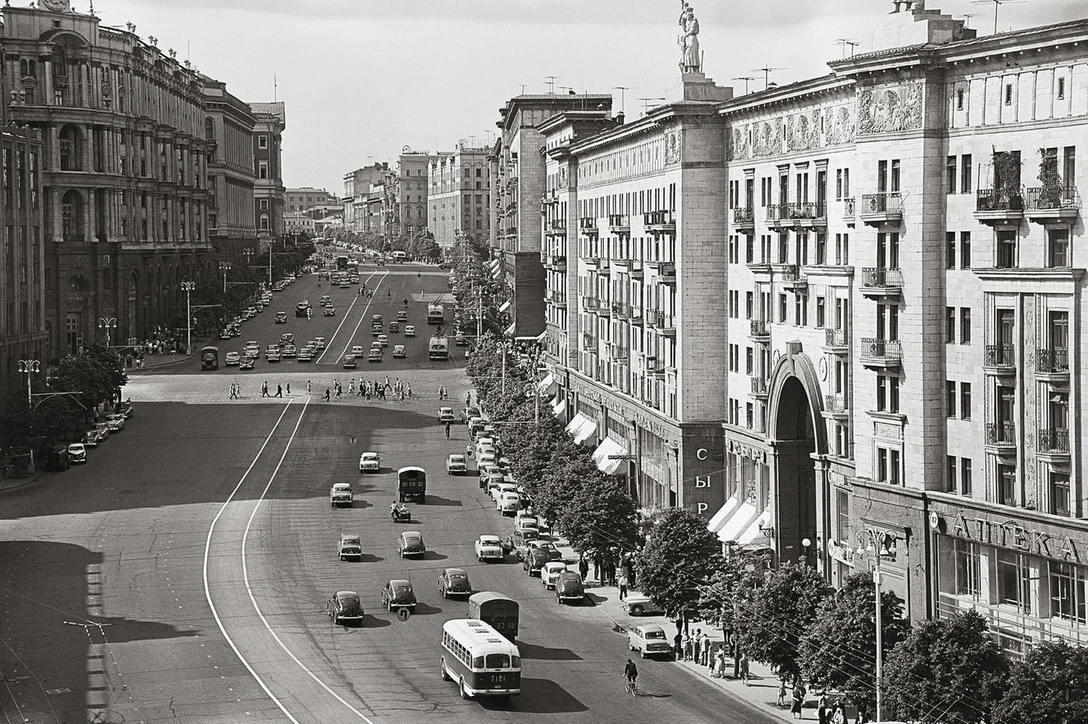 В Советском Союзе квартиры не продавали, а давали за особые заслуги. Одним из таких элитных домов был знаменитый «дом с аркой» на Тверской, 4 — семиэтажное здание, растянувшееся аж на два квартала, в стиле сталинский ампир. Оно было построено в 1937–1939 гг. Нижний этаж, отделанный темными гранитными плитами, занимали кафе и магазины: филиал ГУМа «Подарки», «Диета», «Космос». Архитектором был выбран Аркадий Григорьевич Мордвинов — ему было поручено обновить тогдашнюю улицу Горького, а этот дом стал символом новой эпохи.