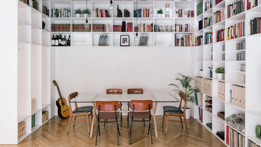 Центральным элементом дизайна стал белый стеллаж, простирающийся на два этажа и занимающий стены гостиной и столовой. На нижнем уровне конструкция включает в себя несколько десятков прямоугольных полок для хранения книг и фильмов, а также место для телевизора. Между столовой зоной и прохожей организован отсек для одежды.