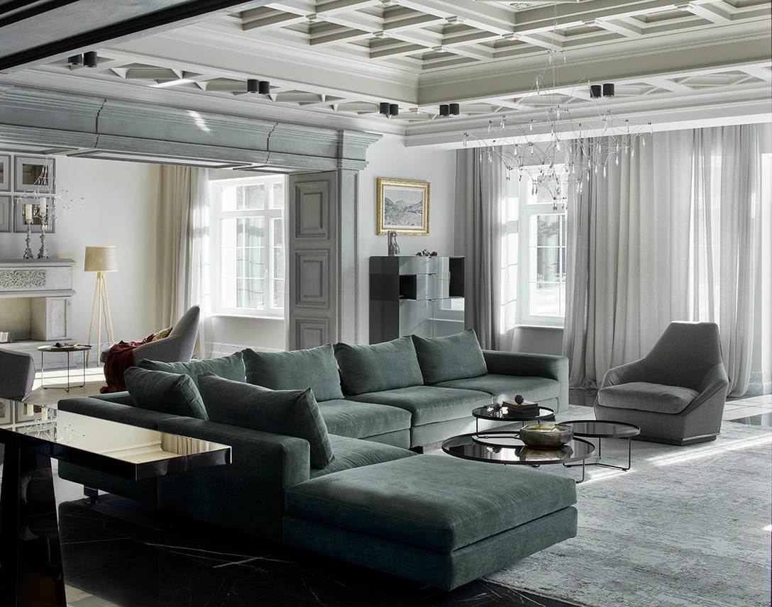 «В гостиной мы решились на сложный гипсовый потолок, — рассказывает дизайнер. — Благодаря ему и массивному каминному порталу возникает ассоциация с обстановкой сказочного замка. Идея пришлась по душе и старшему и младшему поколению. Окна смотрят на горы. Живописный вид, от которого невозможно отвести взгляд».