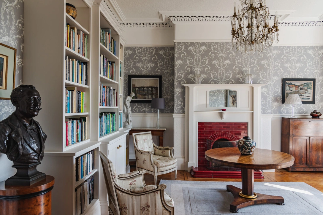 На первом этаже особняка находится большой зал с библиотекой и каминным порталом, выполненным из красного кирпича. Напротив располагается просторная гостиная, оформленная в традиционном желтом оттенке. Дальше по коридору — кухня с выходом в сад и столовая, которую украшают оригинальные карнизы, камин из черного мрамора и окно от пола до потолка.