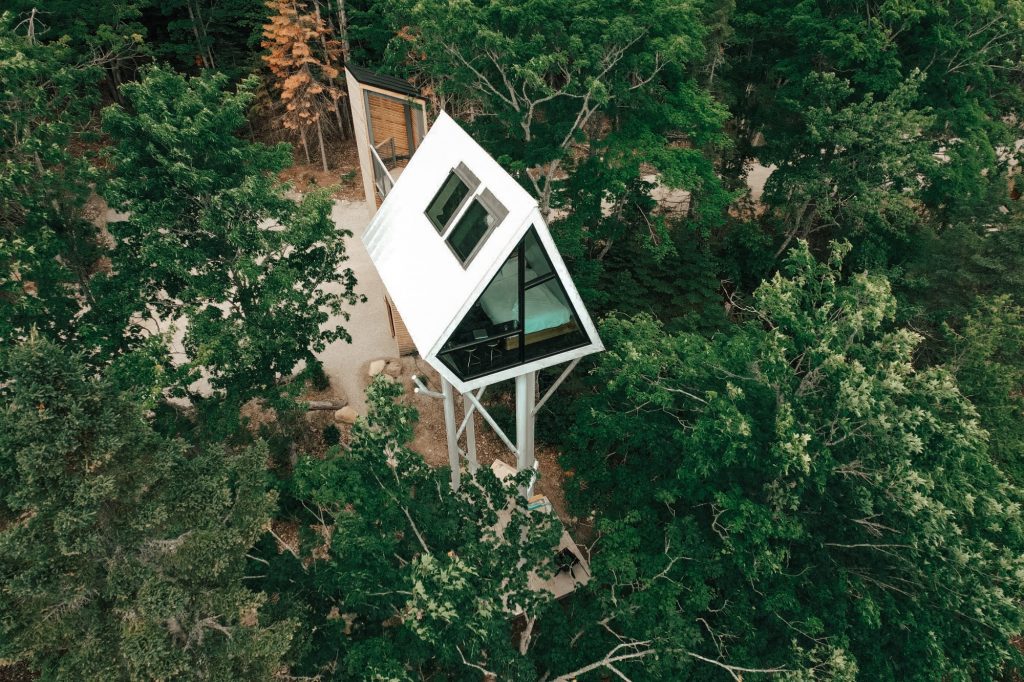 Этот дом для отдыха стоит на сваях на высоте 12 метров над землей — под самыми верхушками деревьев. Через его остекленный торец открывается захватывающий вид на реку Святого Лаврентия в канадской провинции Квебек. Построила этот дом-скворечник канадская студия Repère Boréal, которая дала ему поэтичное название Uhu («сова» на языке местных инну), обыгрывав в названии форму здания.