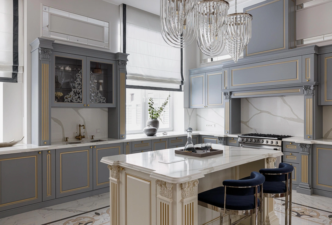 Заказчиком выступал глава семьи, весь проект согласовывался только с ним, а пожелания мужчин, как правило, очень кратки. Клиент привык жить в неоклассических интерьерах с хрустальными люстрами, множеством ковров, ему нравились вензели. И с одной стороны ему хотелось современный интерьер, а с другой — классику со всеми ее атрибутами, которые, в его понимании, выглядят дорого и роскошно. Поэтому мы искали баланс, соединяя люстры со стеклом, лепнину и классическую мебель — с современными светильниками и временами даже с элементами ар-деко.