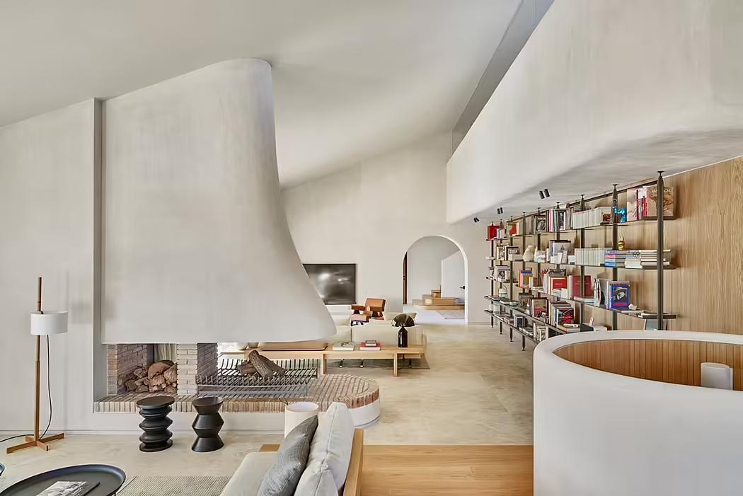 Еще одним элементом, оставшимся от старой планировки, стал большой камин в гостиной. Этот скульптурный элемент сложной формы стал основой всей дизайн-концепции. Отталкиваясь от его формы, авторы проекта создали пространственную игру с другими изогнутыми объемами — проходом двойной высоты и лестницей, ведущей в подвал.
