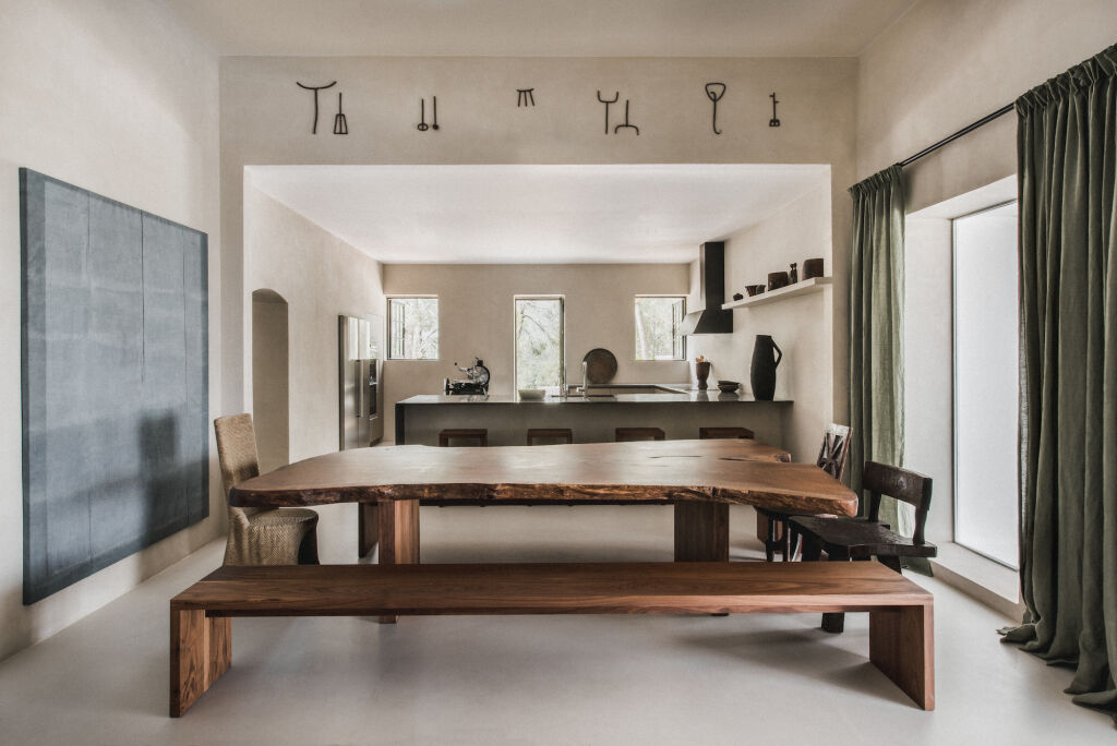 Для интерьеров дизайнер выбрала нейтральную палитру модных земляных оттенков и использовала исключительно природные материалы. Так в столовой появился изготовленный на заказ стол длиной почти три метра из необработанного спила 200-летнего ореха и раковины в ванной комнате из обтесанного натурального камня. В похожем стиле выполнен и деревянный стул из обожженного дерева в прихожей.