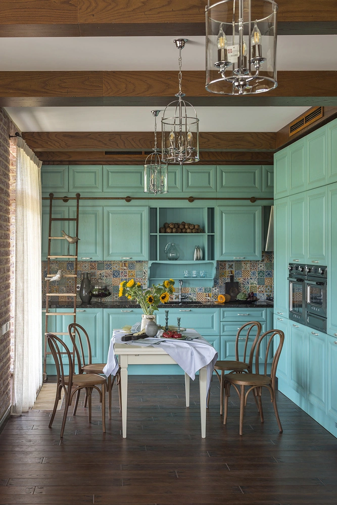 Кухня — самое яркое, насыщенное по краскам помещение в доме. «Кухонные шкафы — итальянские, однако бирюзовая палитра нестандартная. Выкрасы делались по моим эскизам, — рассказывает Константин. — Орнамент плитки ручной формовки, которой выложен фартук, напоминает о средиземноморских интерьерах. А металлическая лестница, которую можно перемещать при необходимости, чтобы иметь доступ к верхним шкафам (она зафиксирована на направляющей оси) — это отсыл к стилю лофт».
