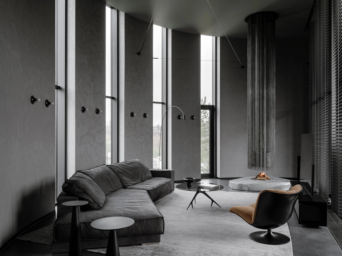 Главной фишкой проекта стал камин в гостиной, изготовленный по индивидуальным эскизам. Нижняя чаша выполнена в виде льдины, а дымоход задекорирован металлическими цепочками, собранными наверху — они напоминают плиссированную юбку.