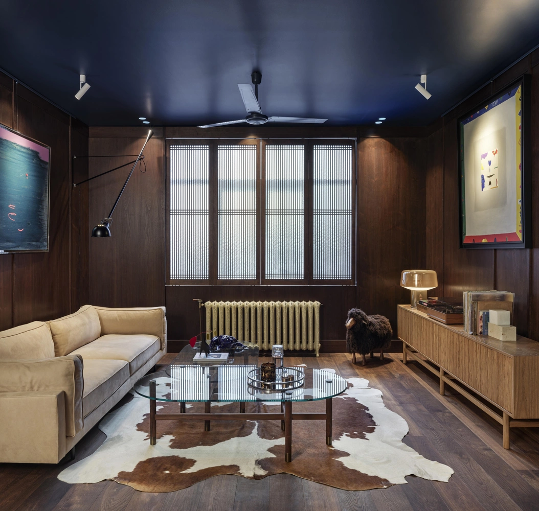 Потолок гостиной выкрашен в темно-синий цвет, а стены облицованы панелями из темного дерева. В зоне для отдыха располагается бежевый диван от Cassina. С ним соседствуют спроектированные студией стеклянные столики и два винтажных кресла, обитых коричневой кожей. В другой части пространства находится книжный стеллаж со встроенным письменным столом.