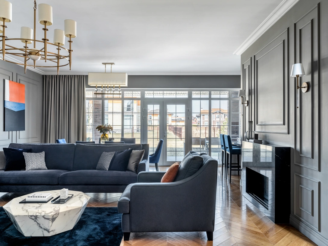 «Первый этаж выдержали в более глубоких, темных тонах. Здесь преобладают благородный серый и темный синий, которые хорошо сочетаются с латунными вставками в отделке светильников и фурнитуры и темным мрамором каминного портала».