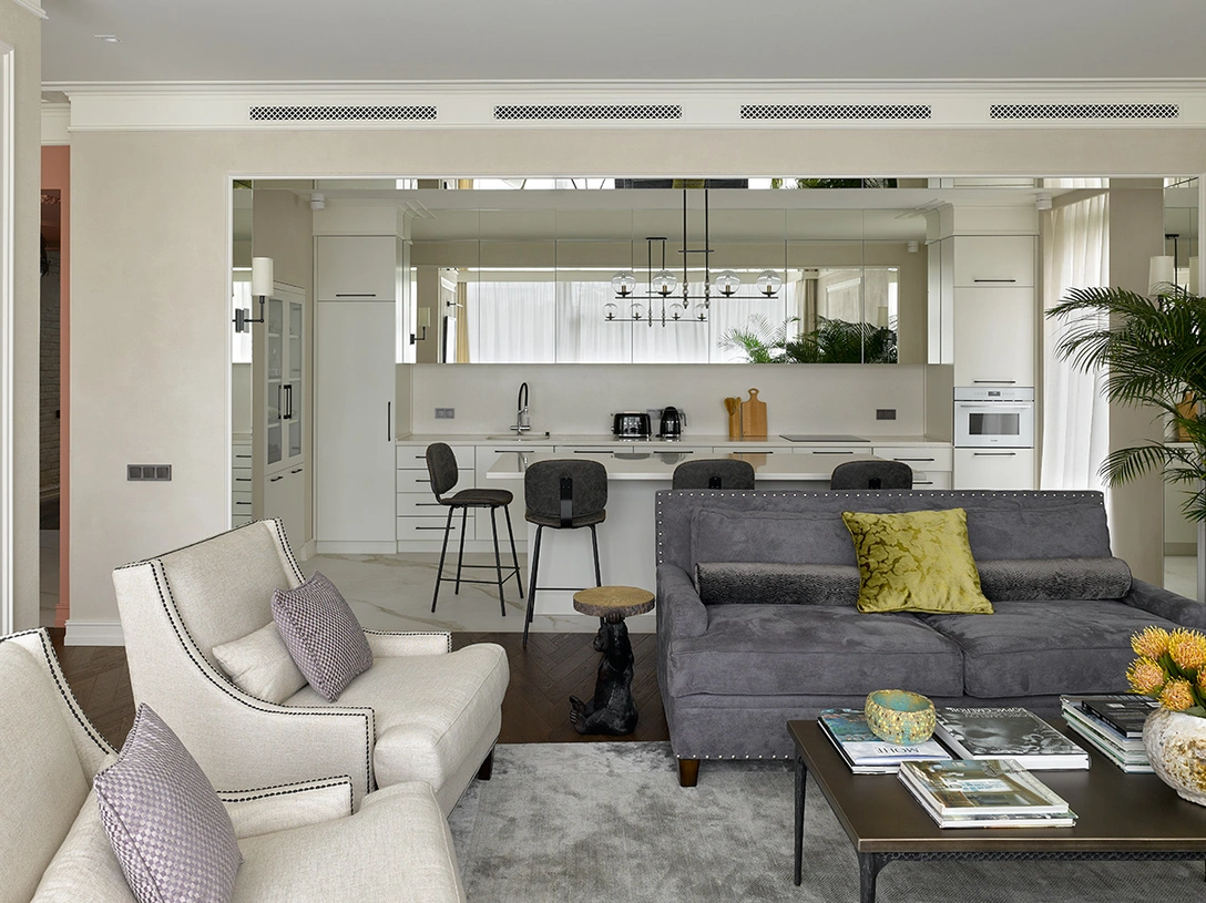 Мягкая мебель в гостиных расположена симметрично, количеством, кратном двум: классика немыслима без ритмичности и повторения.