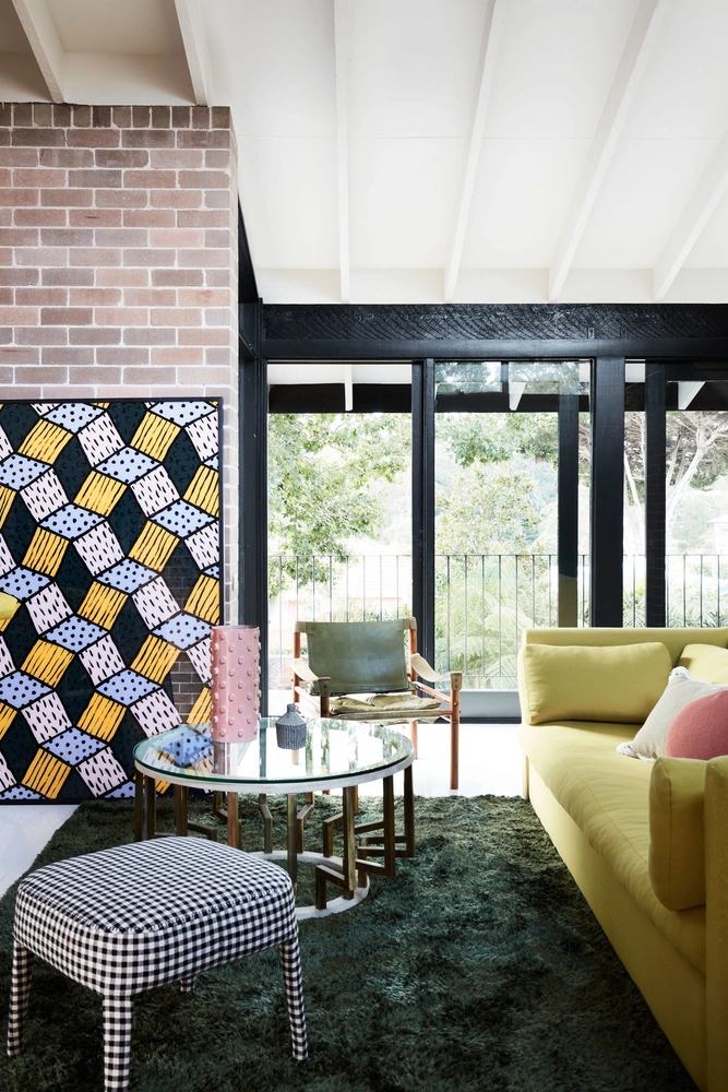 В первую очередь дизайнеры избавились от старого фасада и перенесли кухню на первый этаж. Затем все пространство внизу расширили вплоть до пышного и ухоженного сада, и выложили пол контрастным черно-белым камнем. Для оформления стен дизайнеры привлекли сиднейскую студию Lymesmith: они добавили помещению еще больше цвета и яркости, украсив зону камина абстрактным рисунком. Казалось бы, броская мебель — уже перебор, но дизайнерам удалось и здесь достичь баланса и гармонии.