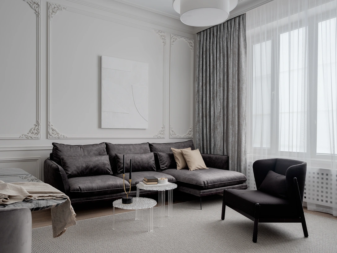 Дизайнеру было важно создать помещения, где, как на чистом холсте, появился бы новый интерьер. Чтобы он выглядел цельным, была выбрана единая отделка в основных помещениях: использовали один тон краски, одинаковую лепнину и способ ее раскладки, общую цветовую гамму мебели. Это сделало образ дома более собранным и элегантным.