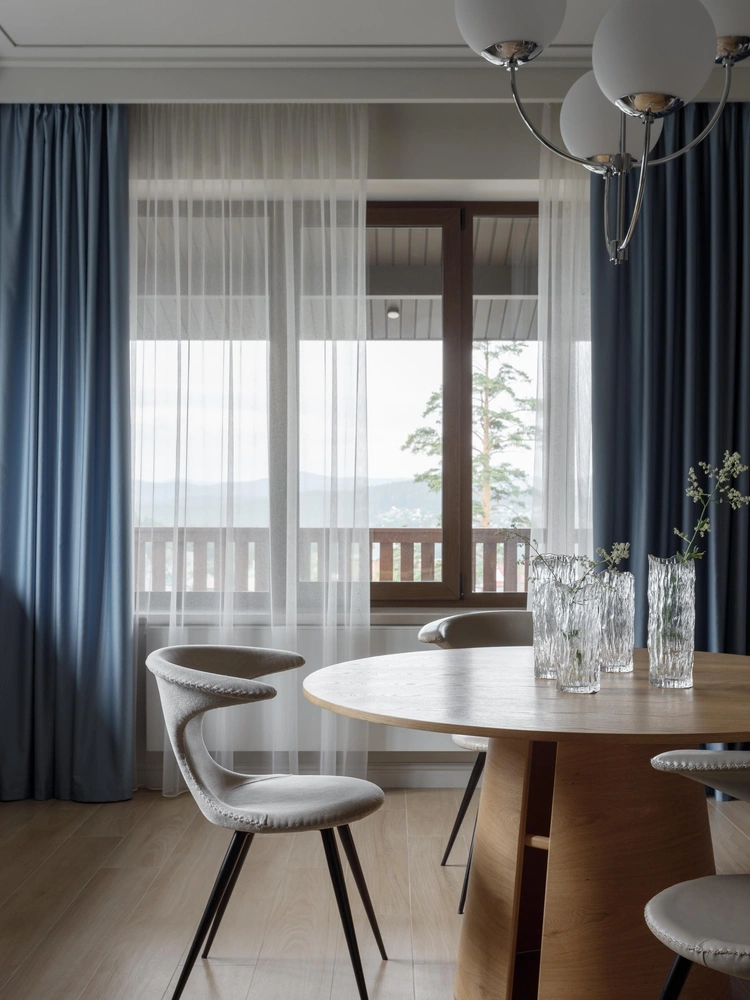 Интерьер строится на гармонии природных оттенков, современный стиль сочетается здесь с элементами классики. Контрастные цвета, но приглушенные оттенки создают ощущение уюта, тепла и не раздражают глаз. В интерьере отражена палитра уральских пейзажей — разные оттенки приглушенно голубого, терракоты — так вид за окном плавно переходит в дом. Природные мотивы продолжаются в натуральных материалах, которые используются в отделке и мебели, текстурах дерева, камня, песчаника и растительных орнаментах.