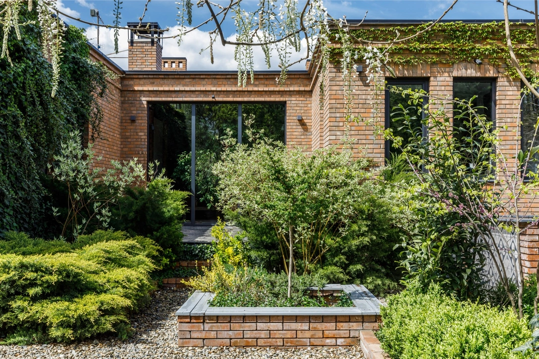 Рыжий кирпич отделяет прохладную гостиную от залитой солнцем кухни