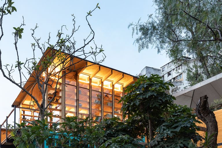 В кабинет-лабораторию можно подняться по отдельной лестнице, не заходя в дом. Модульные стены-стеллажи собраны из вертикальных деревянных балок, разделенных серией полок, таким же образом оформлена крыша. Если северный фасад, обращенный к западу с видом на город, был оставлен полностью прозрачным и позволяет максимально использовать преимущества дневного света, то восточная и южная стороны закрыты белым поликарбонатом, чтобы создать здесь приватную атмосферу. Уютное и безопасное убежище было возведено всего за месяц и может стать прототипом для будущих проектов жилья для тех, кому необходимо работать из дома в условиях пандемии.
