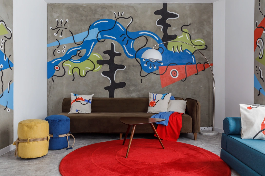 Когда денег нет, что может выручить? Только творческий подход. Алена решила оставить бетон и разрисовать его. Вдохновившись живописью Жоана Миро (Joan Miró) и идеями Ле Корбюзье (Le Corbusier), набросала несколько рисунков, показала заказчице и предложила сделать нечто подобное в ее доме. И та согласилась!