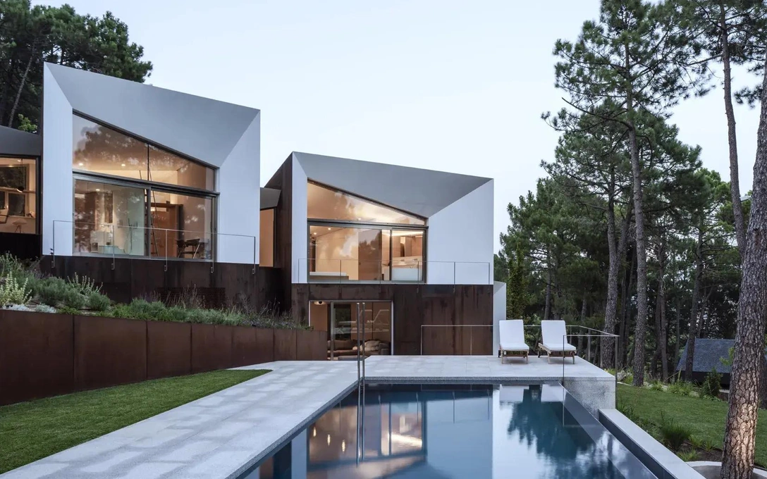 Дом состоит из нескольких компактных объемов, которые помещаются на небольших выступах крутого склона и вместе создают выразительный архитектурный комплекс. Текстура и цвет дома, частично облицованного кортеновской сталью ржавого оттенка, сливаются с цветом земли и красноватыми стволами местных сосен.