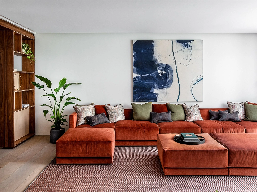 Чтобы создать максимально открытое пространство, команда избавилась от перегородок и заменила их широкими раздвижными дверями. Зона гостиной находится в нише — дань модернистским интерьерам. Одну из стен целиком занимает 5,5-метровый вертикальный сад, превращая лаунж-зону в настоящий зеленый уголок.