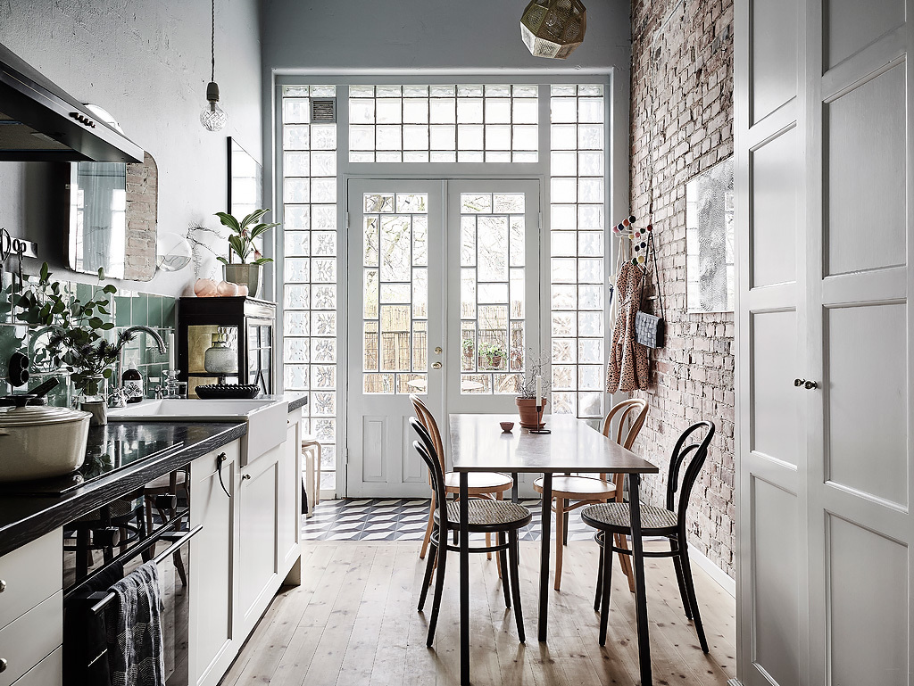 Несмотря на свои скромные размеры, этот таунхаус в предместье Гетеборга сразу производит впечатление: здесь хочется рассматривать все: от высоких, французских дверей, наполняющих пространство объемом, до грубой кирпичной кладки на стенах. Необычная планировка — еще одна особенность этого дома. Открывая входную дверь, попадаешь не в прихожую, а сразу на кухню, оформленную по всем канонам скандинавского стиля: светлый, деревянный пол, белые стены и много комнатных растений.