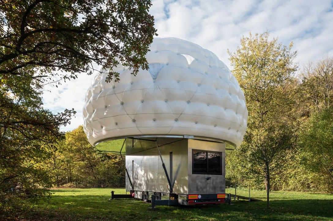 После того, как дом на колесах безопасно припаркован, его крыша открывается с помощью пневматических стоек и создает основание пола. Затем большой купол с двойной оболочкой надувается с помощью компрессора, чтобы сформировать спальню для шести человек.