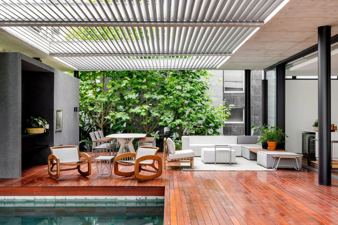 Стеклянные двери на террасу первого этаж открываются полностью, и солнечный свет заполняет лаконичные интерьеры. Архитектор выбрала для дома минималистичную обстановку со светлой мебелью простых форм, добавив к современным предметам классику бразильского дизайна — кресла, столики и стулья Сержиу Родригеса (Sergio Rodrigues), Лины Бо Барди (Lina Bo Bardi), Жозе Занина Калдаша (José Zanine Caldas) и Жадера Алмейды (Jader Almeida).